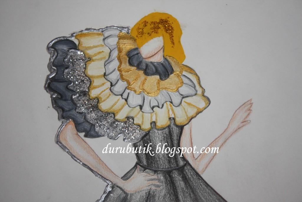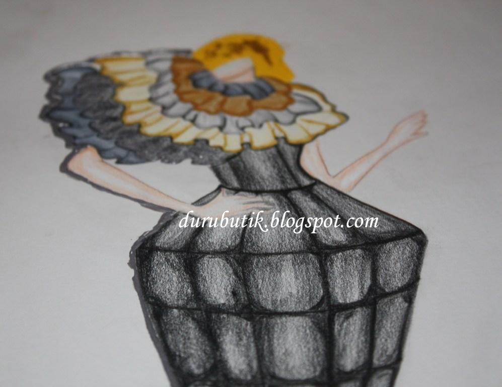 Yarın okulun son günü ama biz harıl harıl kostümün son rütuşları için koşturuyoruz :) Benim defile için tasarlamış olduğum kıyafeti merak edenler olmuştu. Daha yeni yaptım moda resmini. Moda resminde tasarımı biraz daha abartarak çiziyoruz.Artistik olsun diye..Uçuruyoruz kıyafeti deyim yerindeyse:))