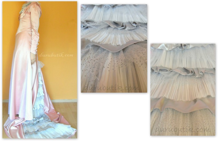 Yakadaki daire katlar ve etek verevden kesilmiş olup hafif bir kabarıklık istediğim için tek kat tül etek diktirerek istediğim volümü elde etmiş oldum.