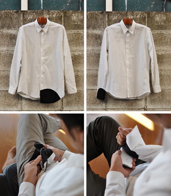 Yine bu düşüncelerle internette keşfe daldığım bir ara çok amaçlı bu gömleği görünce yüzümde kocaman bir tebessüm oluştu. Gözlük kullananlar genellikle kendi mikrofiber gözlük bezleri yerine yakınında buldukları bez parçasına -ki bu genelde kıyafetlerimiz olur- silerler. Bundan hareketle yola çıkan Japon tasarımcılar, mikrofiber gözlük camı temizleyici kumaşını gömlekle birlikte tasarlamışlar. İster kolda ister gömlek ucunda olmak üzere iki çeşit sunmuşlar.